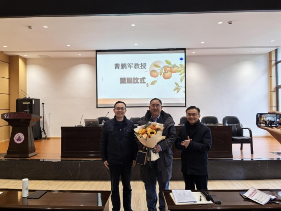 仪式现场,高逸锋和戴庆伟为曹鹏军教授献上象征感恩与祝福的鲜花和纪念牌,祝愿他退休生活惬意舒心、健康顺遂。