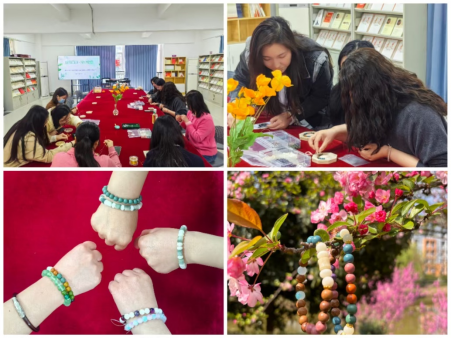 在指尖的穿梭与协作中,一串串风格各异、独具匠心的手串逐渐成型,既有简约雅致的国风款式,也有清新灵动的创意设计,每一件作品都承载着教职工们的巧思与心意。大家佩戴着亲手制作的手串,互相展示欣赏,脸上洋溢着成就感与幸福感。